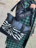 Τσάντα χιαστί και χειρός .Μαύρη Δερματίνη εξαιρετικής ποιότητας πολύ ανθεκτική σε συνδιασμό με ζέβρα γουνάκι .Κλείνει με φερμουάρ περιέχει μια εσωτερική θήκη η οποία κλείνει επίσης με φερμουάρ και δύο ακομη θήκες για κινητό και πορτοφόλι αντίστοιχα.