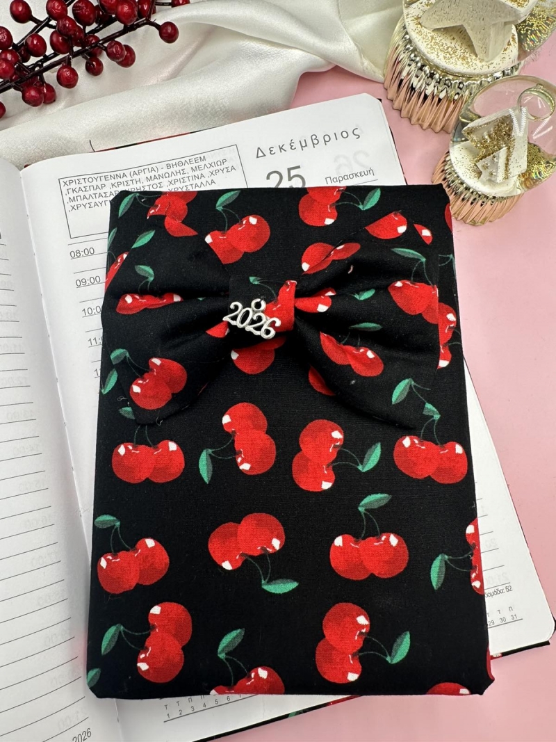 Χειροποίητο Μοναδικό Μεγάλο Εβδομαδιαίο Ημερολόγιο 2026 .Μαύρο με κόκκινα κεράσια Με φράουλες και ασορτί Φιόγκο.